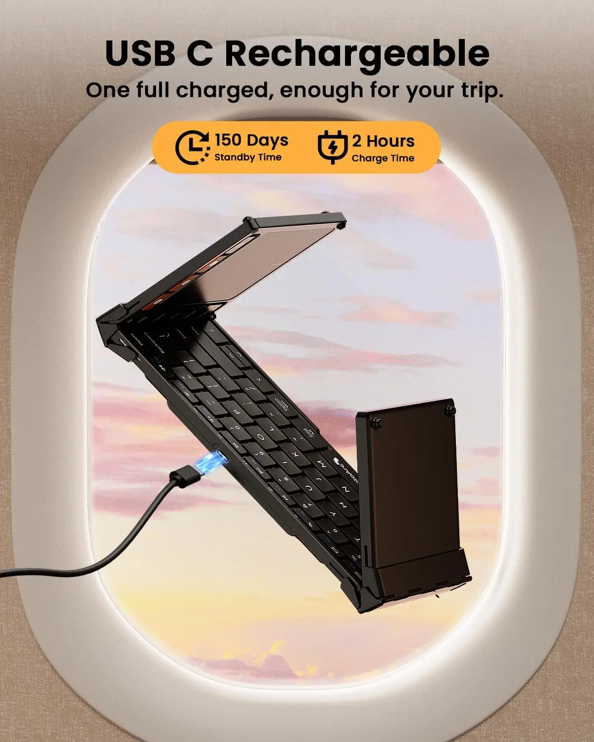 【Type C Rechargeable】 The fold up keyboard have a built-in powerful 300mAh battery, allows standby time lasts 120 days. It will enter sleep mode after 60 minutes of inactivity to save power, you can press any key to activate and use. When not in use,fold up the keyboard to turn off(unfold to power on).